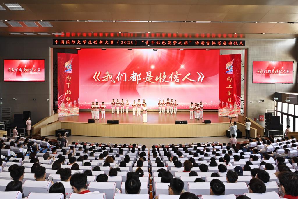 启动仪式以“我们都是收信人”为主题,活动现场全体人员重温了习近平总书记给中国国际大学生创新大赛参赛学生代表回信精神。青年学子代表演绎了宣言曲目《我们都是收信人》《强国一代有我在》,向参加中国国际大学生创新大赛(2025)吉林省赛的全体选手发出倡议,以回信精神为行动指引,向下扎根、向上生长,奋力书写为中国式现代化挺膺担当的青春篇章。