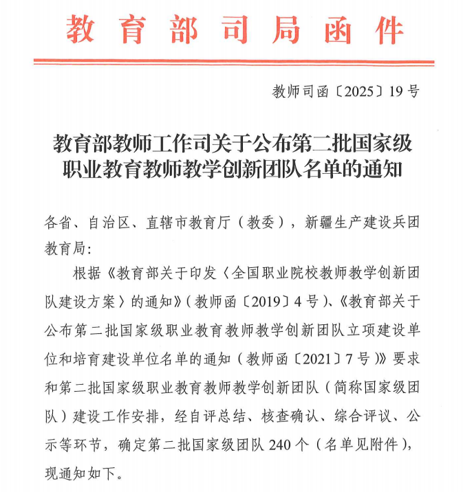 近日,教育部发布《关于公布第二批国家级职业教育教师教学创新团队名单的通知》,我校电气自动化技术专业教师教学创新团队被确定为第二批国家级职业教育教师教学创新团队,成为我校首个国家级职业教育教师教学创新团队,标志着我校在职业教育教师队伍建设、专业教学创新领域实现国家级团队建设“零的突破”,为学校职业教育高质量发展注入强劲动力。