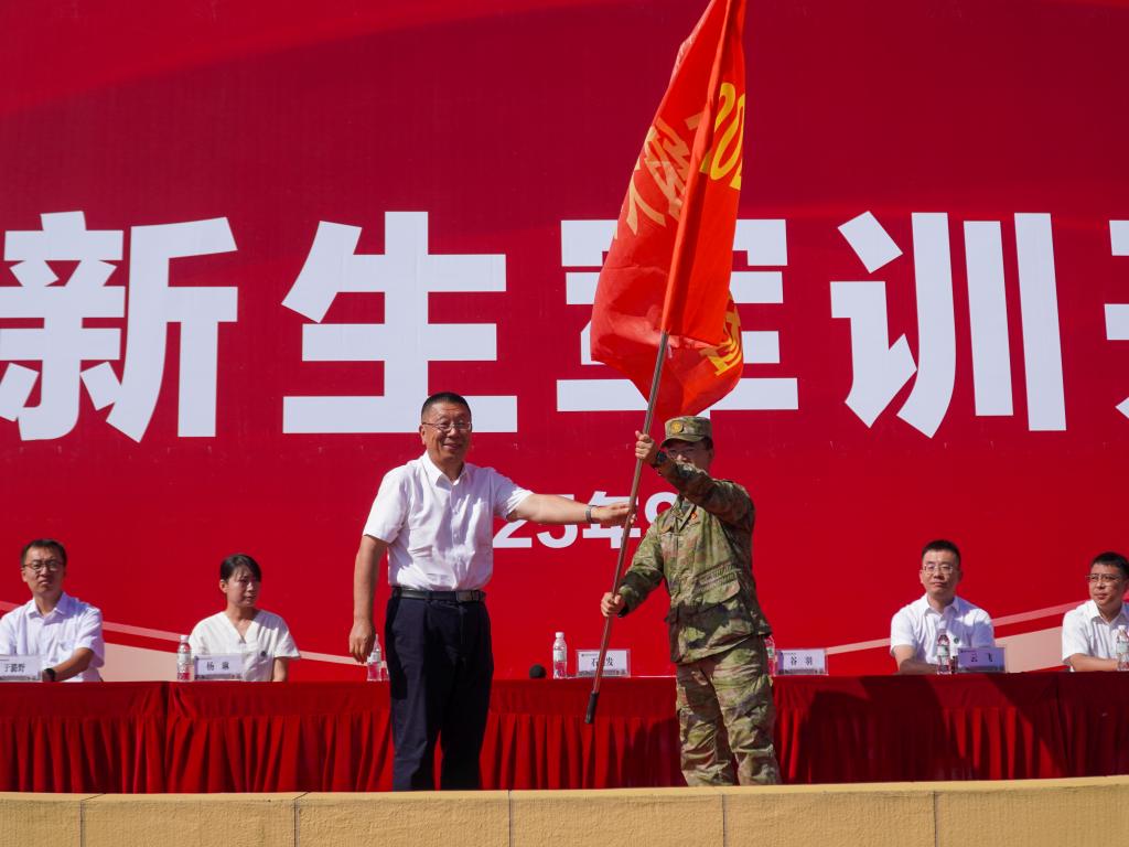 仪式上,学校领导向军训团团长授予军训团旗。鲜红的团旗象征着责任与传承。